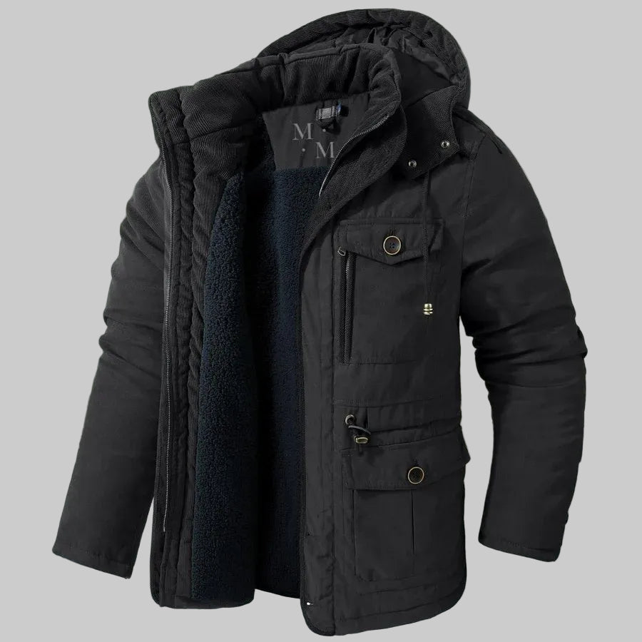 The interior is lined with a textured fabric that is visible along the inner panels and the hood. The sleeves are long with plain cuffs. On the front there are several pockets: a flap pocket with a button on the chest, a vertical zip pocket beneath it, and two lower flap pockets with buttons and stitched edges.
