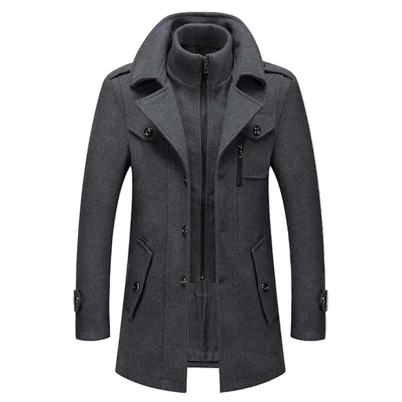 This layered men’s jacket features an outer layer with a collar, lapels, and a front button closure. The inner layer has a zip closure and a high collar. The jacket includes two angled waist pockets and chest pockets.