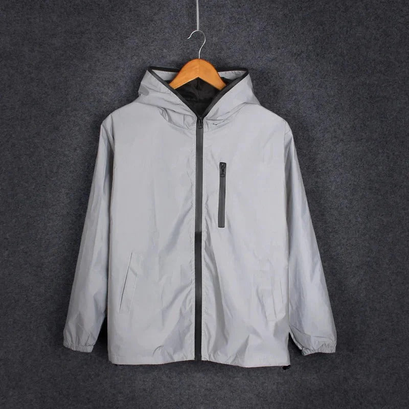 This men's reflective hooded jacket features a full-length front zipper. The jacket has a central zipper from the hem to the neckline. There is a zippered pocket on one side of the chest.