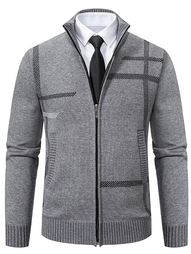 This men’s zip-up cardigan features a stand collar and long sleeves. The cardigan has a full-length zipper that runs from the bottom hem to the top of the collar. Ribbed knit trims are applied at the collar, cuffs, and hem. At the front, there are two vertical side pockets positioned at waist height.