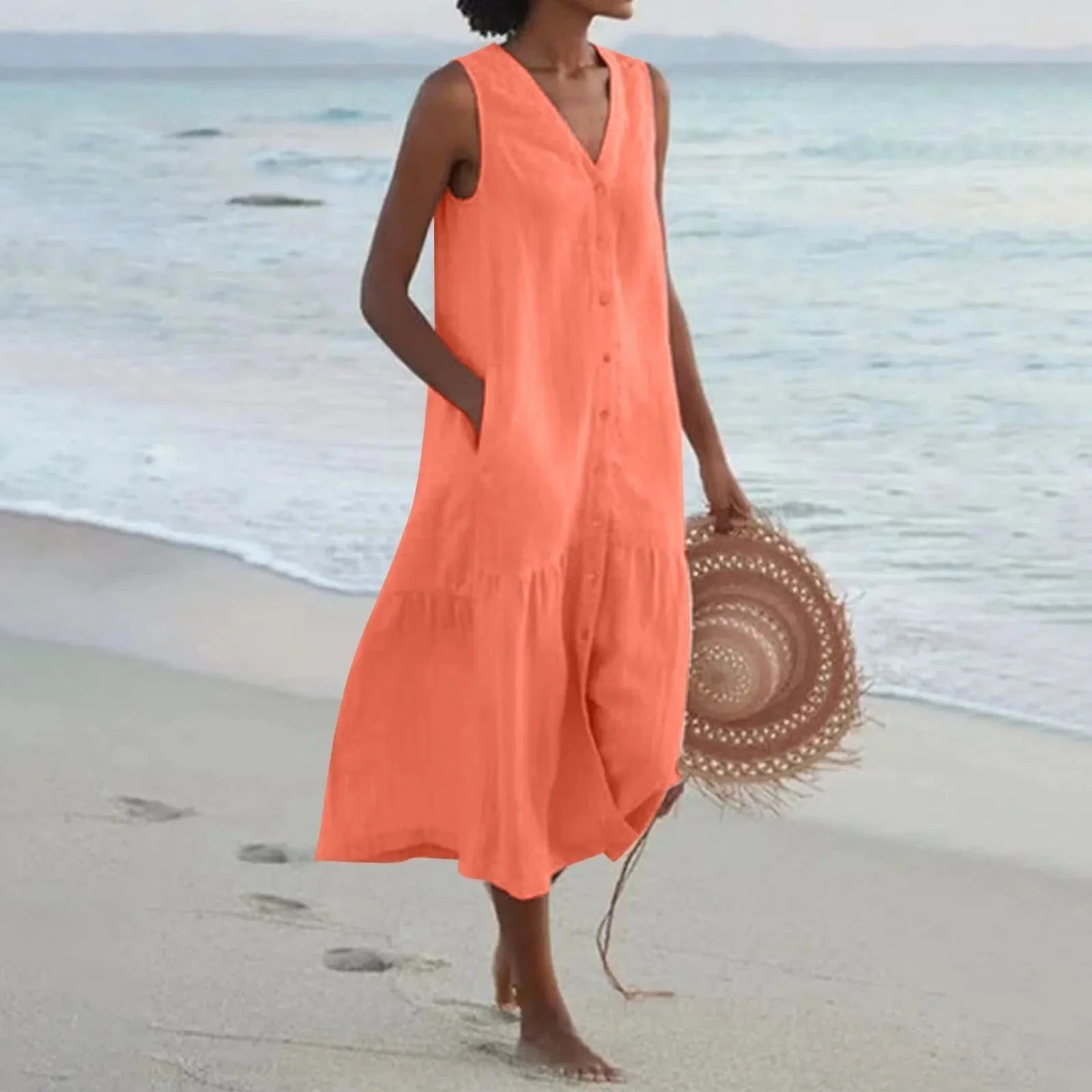 This women’s dress is sleeveless and features a V-neckline. It has a full-length button placket running down the center of the front. The bodice is loose-fitting and transitions into a tiered skirt. Discreet side pockets are integrated into the seams.
