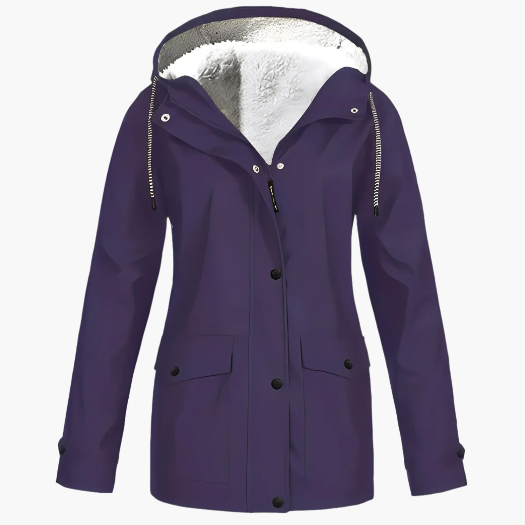 This jacket features a hood with a drawstring and adjustable cords, and is lined with a textured material in both the hood and the main body. The front has a full-length zip closure along with a vertical row of snap buttons. The jacket has long sleeves and two front flap pockets at hip height.