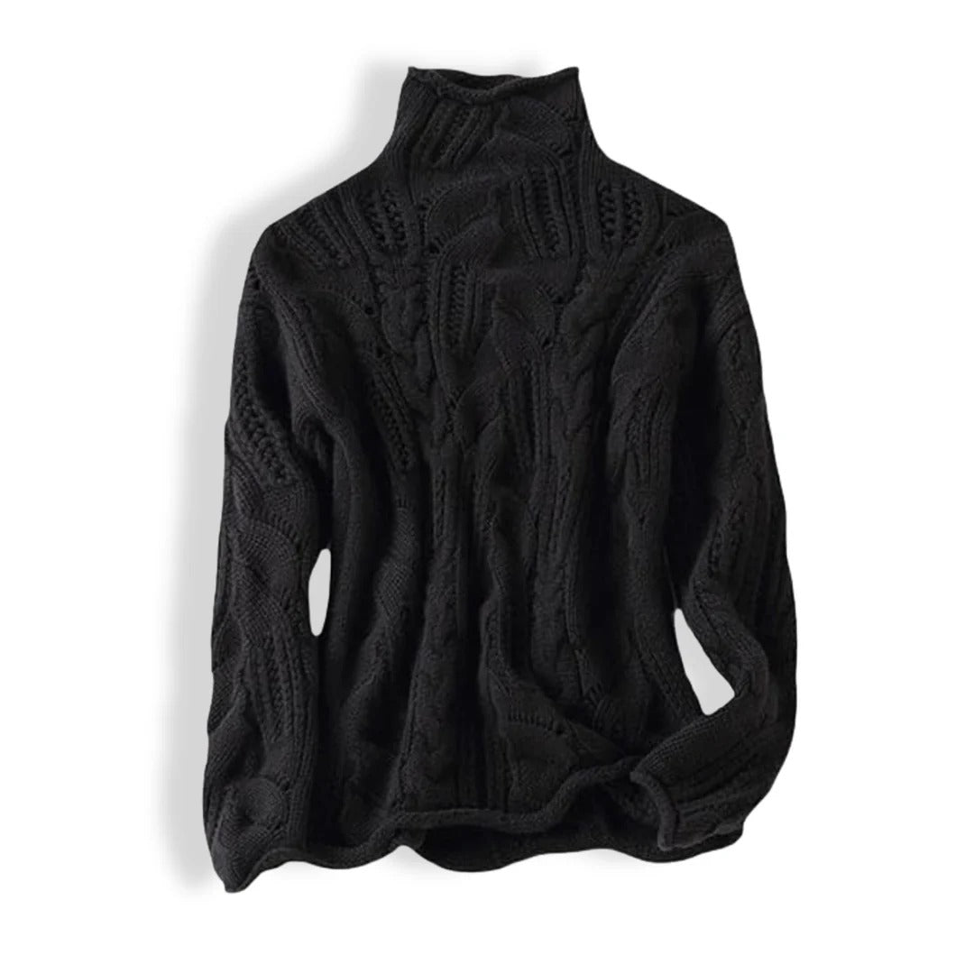 • Neckline: A high turtleneck forms the neckline and sits above the shoulder line. It is fully knit and matches the cable pattern used on the body.