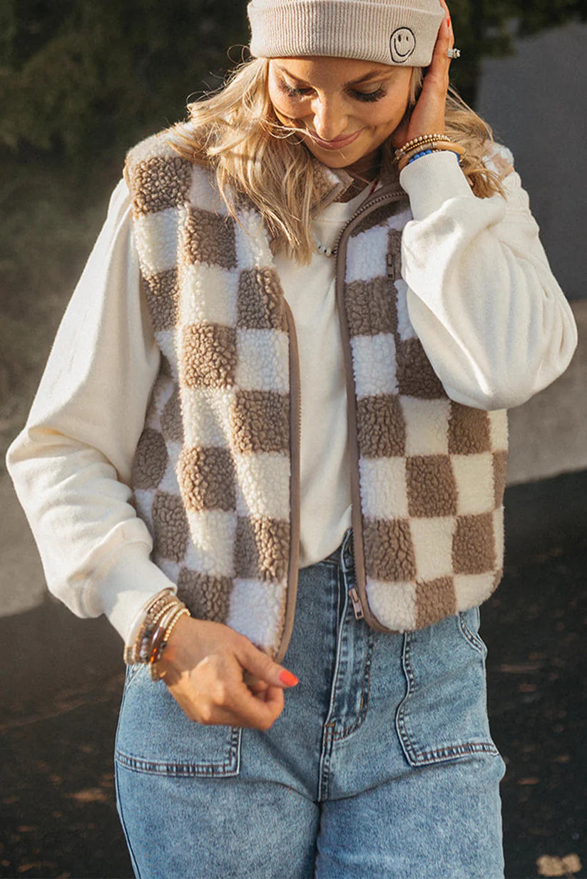 This women’s vest features a high stand-up collar and a full-length front zipper. The vest is decorated with a repeating checkered pattern across the entire body. A small vertical zippered pocket is located on the upper chest. The edges of the armholes, center front, and hem are finished with narrow piping.